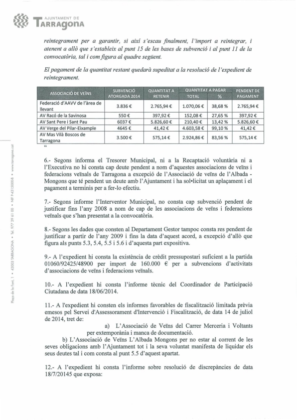 Adjunto aquest document de les entitats veïnals que han rebut subvencions de l'Ajuntament. Subratllo el punt nº3 per tal que reparem en l'ambigüitat de les raons que mouen al Consistori per a concedir-les.
